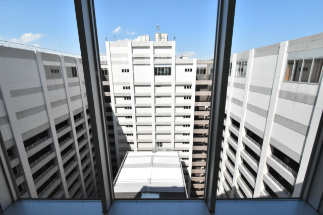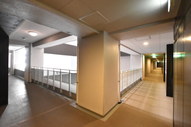 建物がロの字型になっている関係で途中には吹き抜けになっている部分があり、明るい外光が射し込んでいます。タワーマンションは完全に内廊下になっていることが多いのですが珍しいですね。