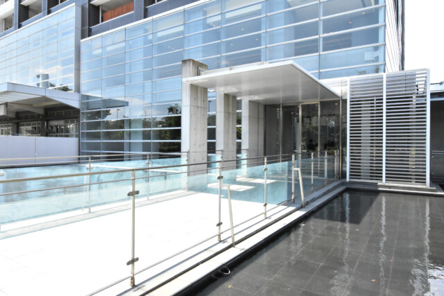 ガラスとシルバーのスタイリッシュなエントランス。水盤の真ん中の通路を進んだ先が入口になります。光の当たり方でキラキラと輝く水面とガラスがとても綺麗ですよ。
