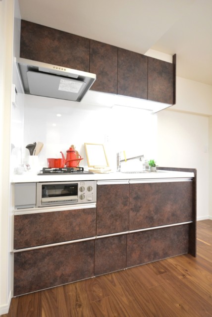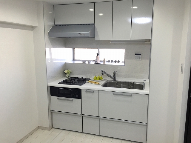 キッチンは、お部屋のフローリングと色調を合わせたホワイトキャビネットのシステムキッチンです。