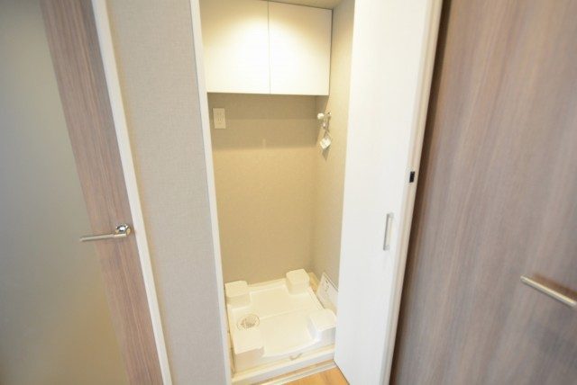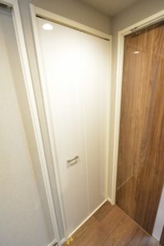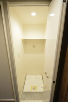 隣の白い扉は洗濯機スペース。棚があり中に洗濯グッズを入れておけます。照明付きなのも嬉しいですね。