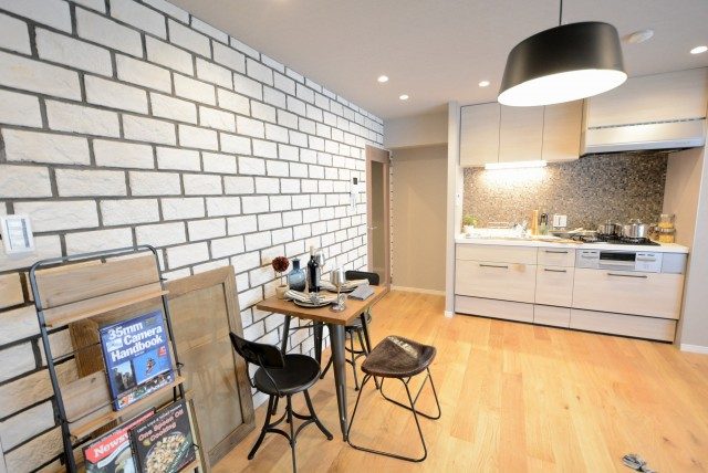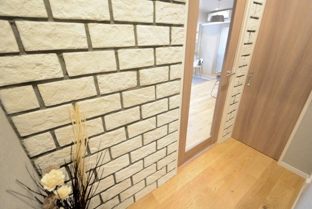 廊下から続いているレンガ調の壁がモダンな雰囲気を出しています。