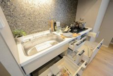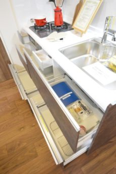 シンク下の収納は引き出しタイプ。デッドスペースが生まれにくく、奥まで無駄なく使うことが出来ますよ。引き出しタイプが主婦層からの熱い支持を得ているのも納得できると思います。