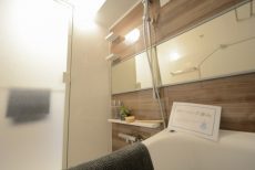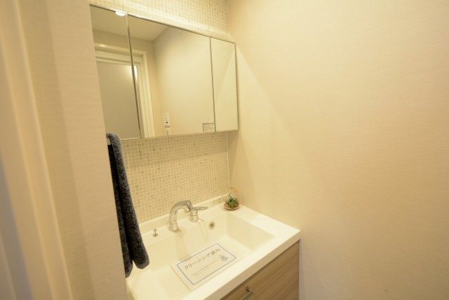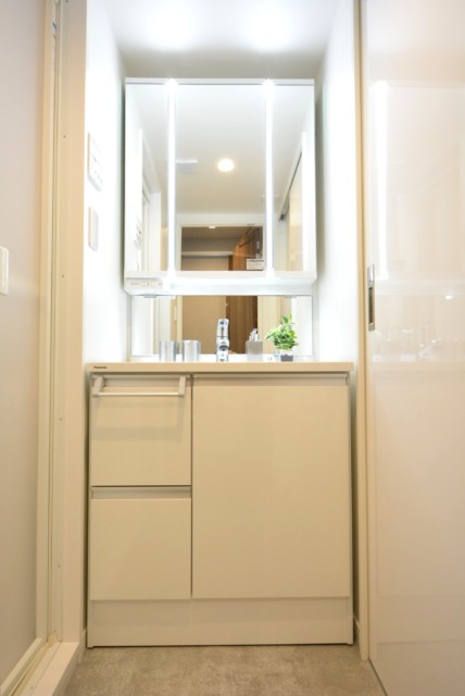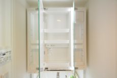 洗面台は三面鏡付き。白一色で清潔感がありますね。三面鏡の間にライトが設置されていて、鏡を見る時に影になったりもしませんよ。