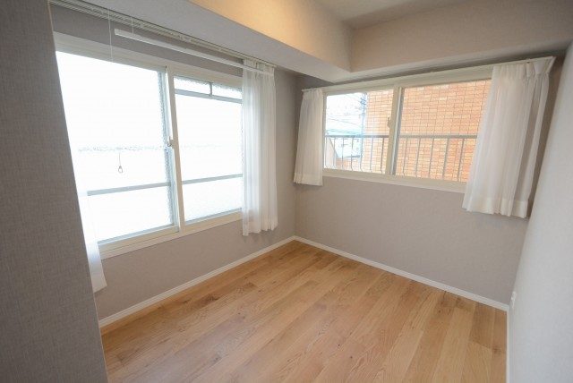 約5.3帖の洋室になります。バルコニーに面した大きな窓の付いた明るいお部屋、大きめのベッドでも余裕で入ります。