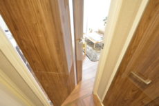 廊下反対側には姿見付きの収納棚。お出かけ前の身だしなみチェックはこちらでどうぞ。
