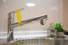 水栓は浄水機能付きシャワー水栓。切替えひとつで気軽に美味しいお水を使う事が出来ます。ヘッドが伸びてシンクのお掃除などにも便利ですよ。