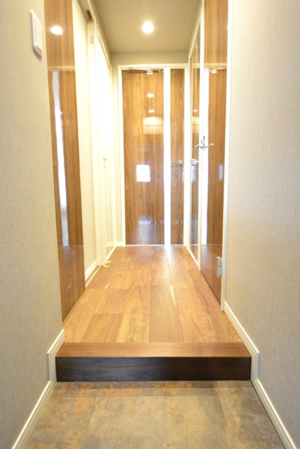 廊下はブラウン多めの落ち着いた雰囲気。建具は鏡面仕上げで高級感もあります。上り口が少し高めですが、座って靴を履いたりには便利ですよ。