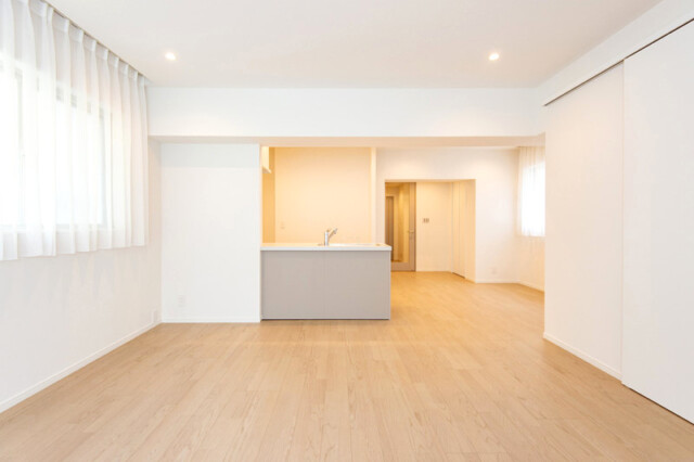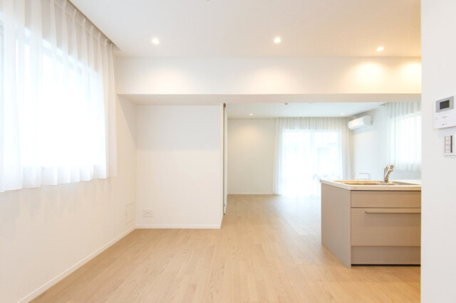 東南西に窓のある採光通風ともに良好なお部屋です。入ってすぐがダイニングスペース、キッチンの向こう側がリビングでしょうか?家具が置かれていなくても生活のイメージがつくくらいレイアウトはしやすそうです。梁もゾーニングにぴったりの位置ですね。