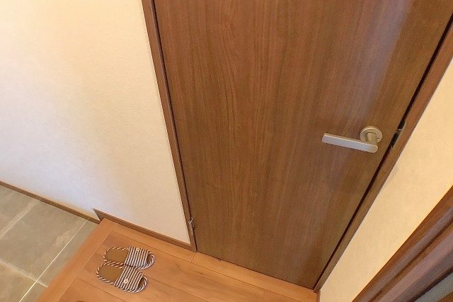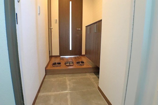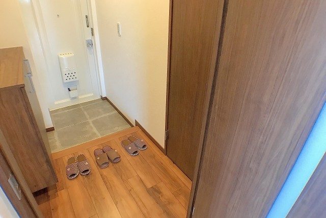 玄関ホール先は廊下になっており、右側にシューズBOX、トイレ、正面にLDKの扉があります。フローリングも建具も木目調であたたかみのある雰囲気です。