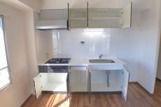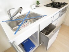 キッチンは清潔感のある白。浄水機能付き水栓、3口ガスコンロ、食洗機付きとスペック◎!冷蔵庫は向かって左側に置けるようになっています。