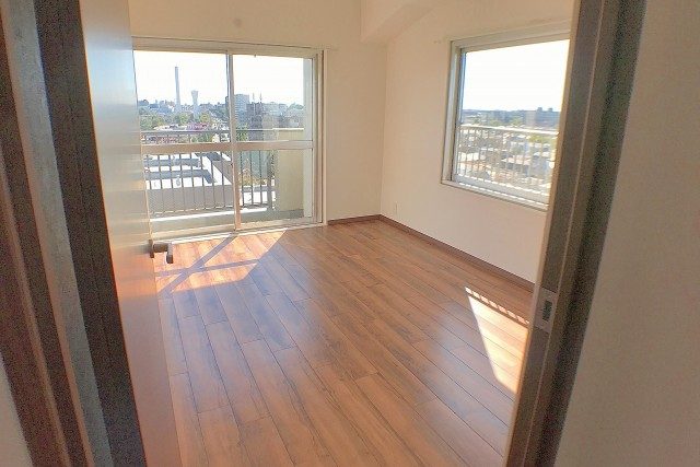2枚の可動扉側の洋室は約6.0帖。2面に窓のある明るい空間です。
