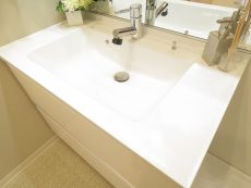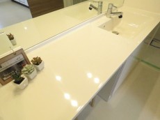 洗面化粧台は広々したカウンターが印象的。2人並んで使える広さなので朝の忙しい時間も洗面室が渋滞しなくて済むかもφ(.. )