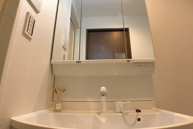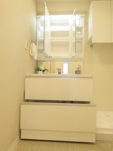 歯ブラシや基礎化粧品などの小物はミラー内部へ、洗濯洗剤などは足元に収納するのが良さそうですね!!