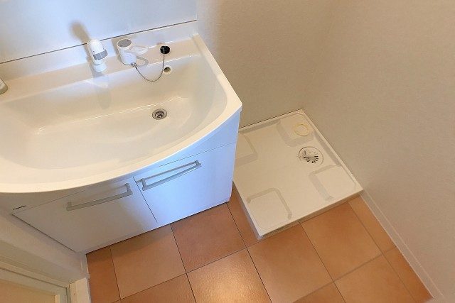洗面室。ここには洗面化粧台、洗濯機置場、バスルームがまとまっています。