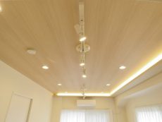 照明はダウンライトとダクトレールにスポットライトが設置されており、お部屋全体をやさしく照らしてくれています。木目調の天井もステキです♡