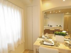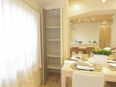 LDKの窓は出窓。二重サッシになっているので環八の騒音は気になりません。窓と窓の間に植物を置いて緑を楽しむのもいいですね。LDK内にも可動棚付きの収納が設けられています。