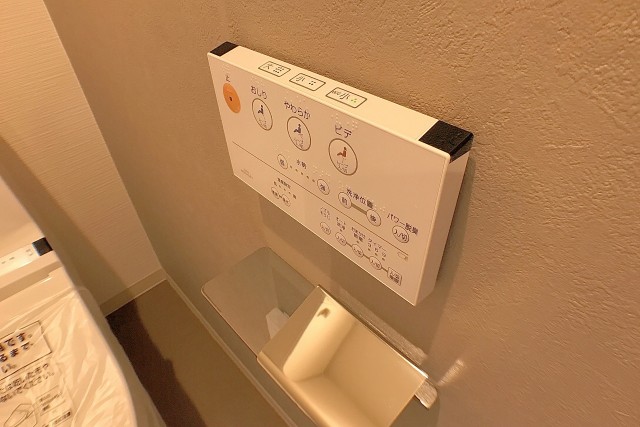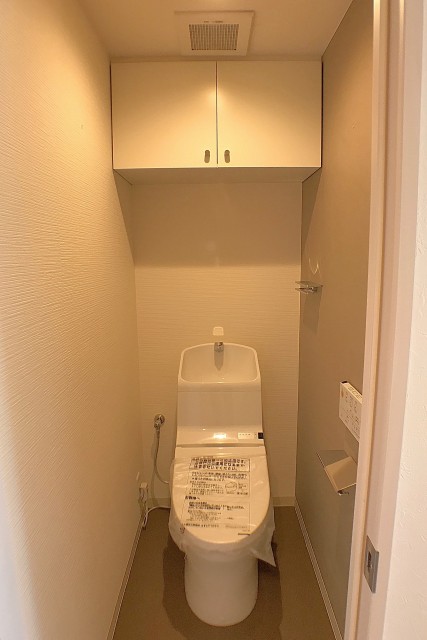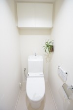 トイレはもちろんウォシュレット。収納棚も上にあります。