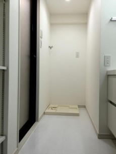 洗濯機置場です。棚等は設置されていませんので、後から棚を設置したり、突っ張り棒で収納を作ったりと工夫したいですね。