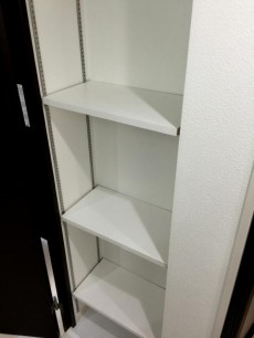 バスルームの横には、可動式の収納棚が設置されています。リネンの収納に嬉しいです。
