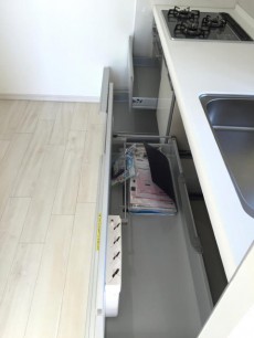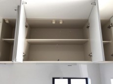 収納も上下にあるのでキッチン用品をたっぷりとしまっておけますよ。シンク下のキャビネットはスライド式なのでキッチングッズの収納も楽々(●´∀`●)