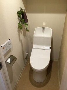 廊下に戻って、お隣のトイレは嬉しいウォシュレット付き。上部には扉付きの棚があるので、ストック品の収納や消臭剤を置くスペースとして利用してみて下さい♥♡