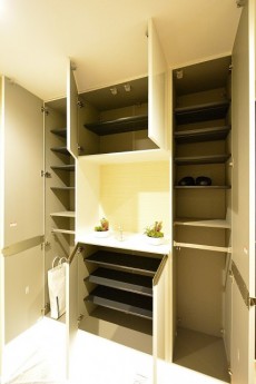 シューズボックスはトールタイプ。棚板の高さが変えられるのでブーツなどでも収納可能です。