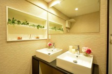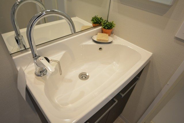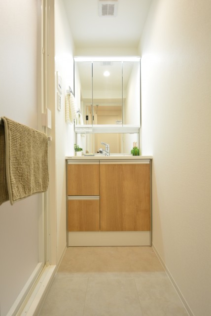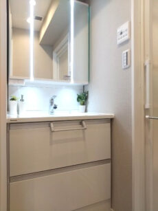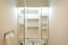 ダブルボウルの洗面台で同時使うことができ、鏡が大きいのもうれしいですね!