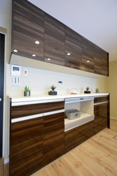 大きなキャビネットが設置されていて、カウンターには電子レンジなどキッチンまわりの家電を置くことができます。