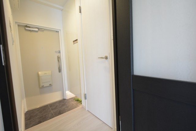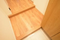玄関ドアを開けると、段々になった廊下が伸びていました。廊下途中で段があるのは珍しいですね。少し濃いめのフローリングに白のクロスでナチュラルな中、金具の黒がスタイリッシュな雰囲気を出しています。