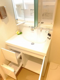 洗面台はボウルが大きくシャンプードレッサータイプで三面鏡の裏も収納になっていて機能的です。