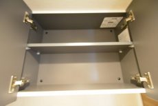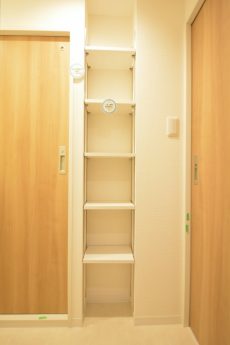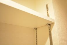 洗面室入ってすぐにはリネンの収納棚があります。、高さ調整可能ですので使いやすいように調整しましょう。