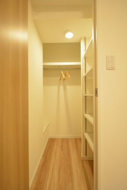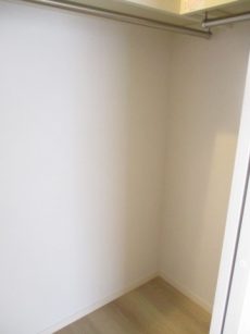 お部屋には約1.1帖のウォークインクローゼットが付いています。中はL字型に反対側設置されていて、広い床面に衣装ケースを置いたりも出来そうですね。