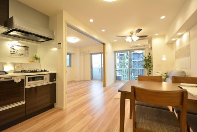 仕切りを閉めた時のリビング・ダイニング・キッチンの様子です。これはこれで落ち着いた感じでいいですね。