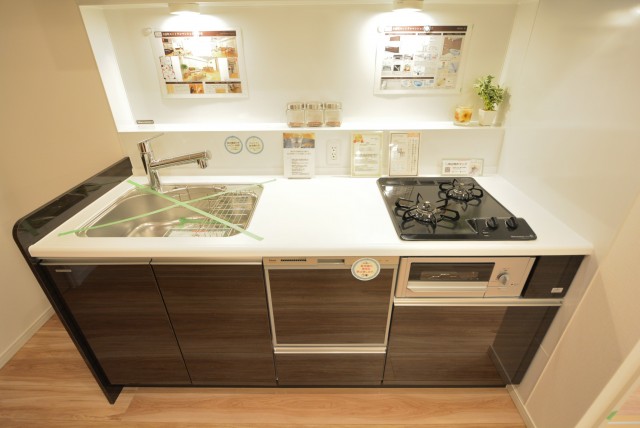 設備は3口ガスコンロ、グリルに浄水器一体型水栓も付いていて充実しています。