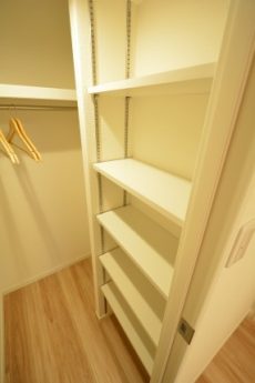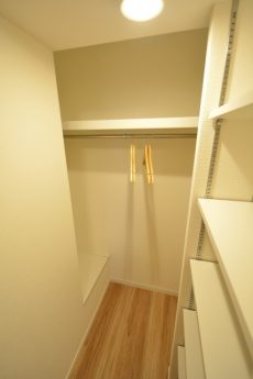 こちらはマルチウォークインクローゼットですね。約1帖で、ハンガーパイプの他に収納棚などが造り付けられています。