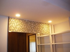 壁面にあしらわれたモザイクタイルが印象的な洗面化粧台。