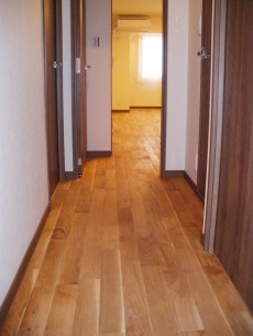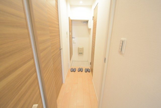 廊下の奥にリビングダイニング。手前右側には洋室があります。