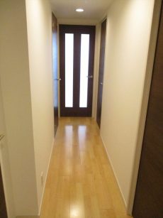 扉を開けると フルリノベーションを終え綺麗に生まれ変わった玄関です。入って左手に天井まで続く大きなシューズボックス。可動式の棚なので、靴のサイズに合わせてご自由にアレンジしてください。廊下は左手にダイニングキッチンまで伸びています。