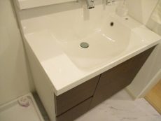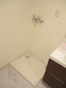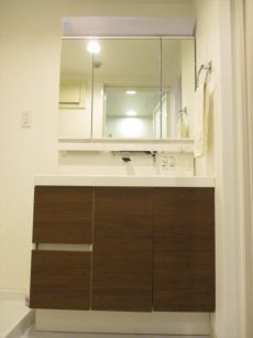 お次は、廊下反対側に位置する水回りを♪♪洗面室には、大きな三面鏡の洗面台。大きな鏡が魅力的な洗面台は収納もバッチリ☆