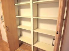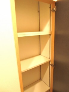 シューズボックスの隣りに物置があります。棚が可動式なので、掃除機などのちょっと大きめの物までしっかり収納できますよ(^v^)