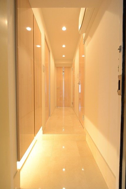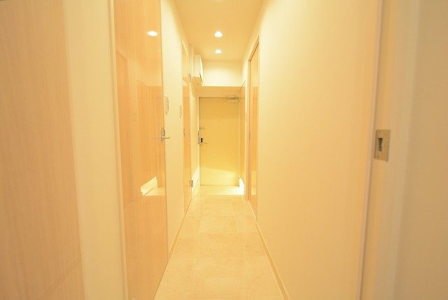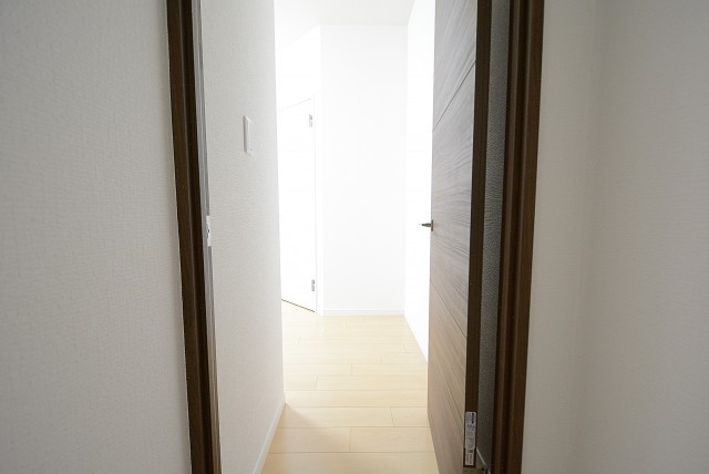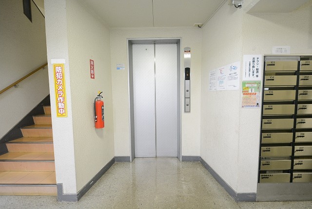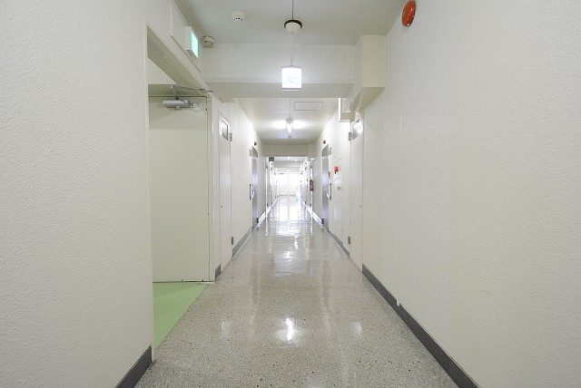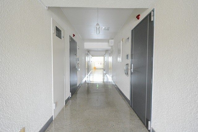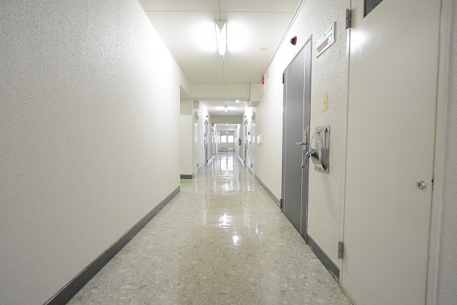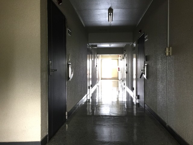 エレベーターを降りると、内廊下。少し暗めですが、雨が吹き込むようなことが無いので、雨の日も安心ですよ♪