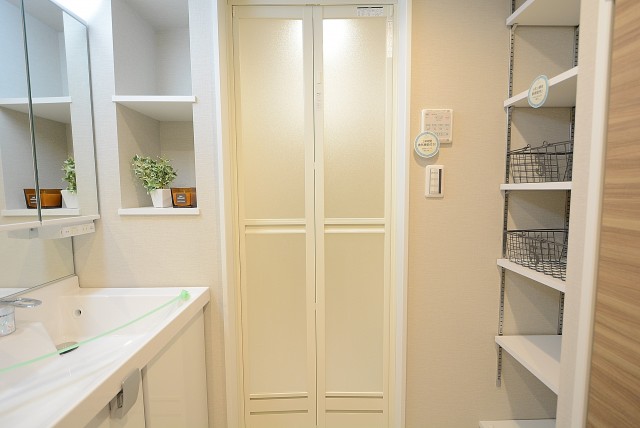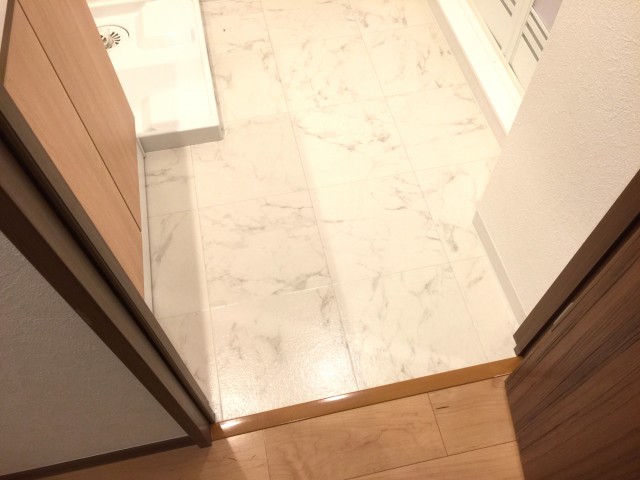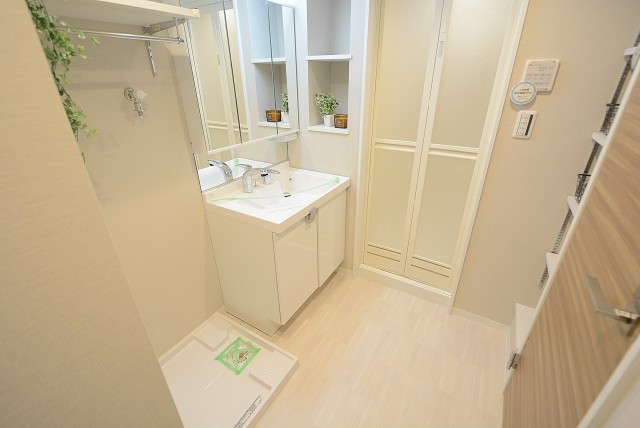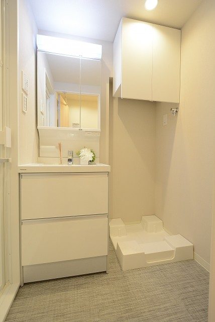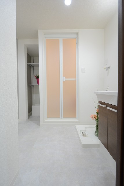 それでは水回りのご案内へ(o´∀`ノまずは洗面室。右手にバスルーム、左手に洗面台と洗濯機置場の並びになっています。段差が無く、移動もスムーズ♪♪
