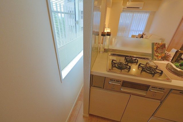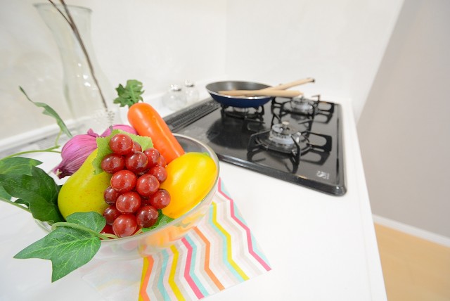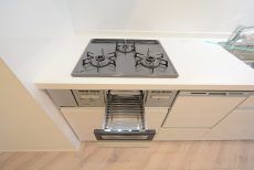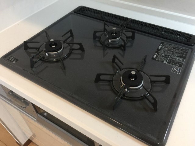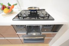 コンロは3口のグリル付きガスコンロ。グリルも付いていれば日常のお料理で困ることは無さそうですね。中に入るサイズの鉄鍋があれば煮込み料理も可能ですよ!