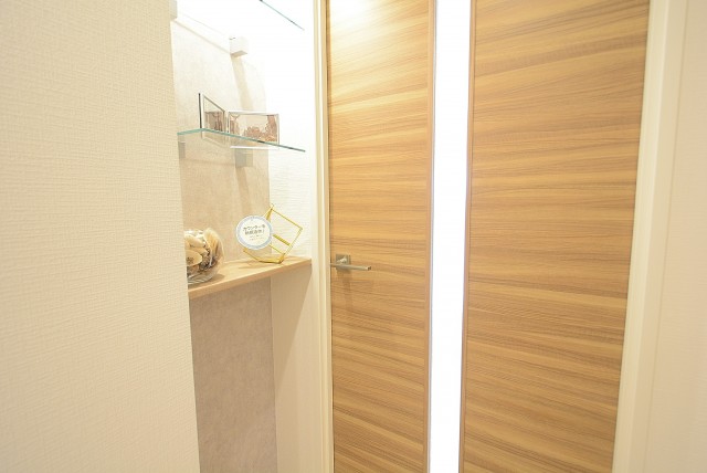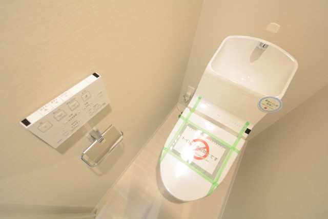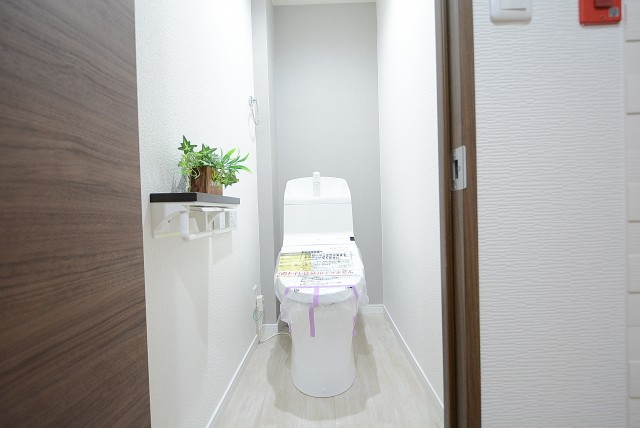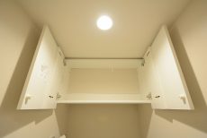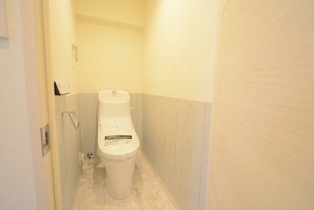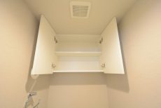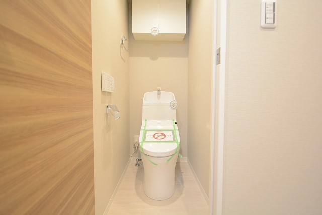 洗面室と廊下を挟んで反対側にトイレがあります。嬉しいウォシュレット付きです。上部には、扉付の収納棚があるので、ストック品の収納も完璧です♪♪