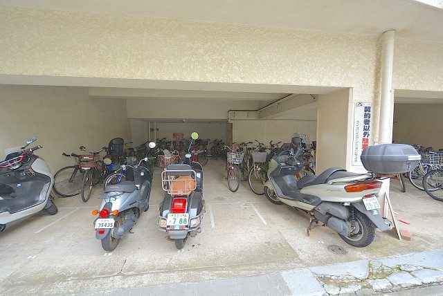 マンションの1F部分にバイク置場&駐輪場。バイク置場は月額1,500円、駐輪場は年額3,000円から3,600円です。屋根もあるので雨にぬれません。