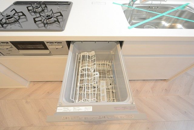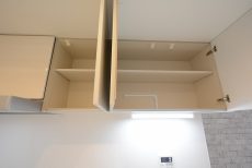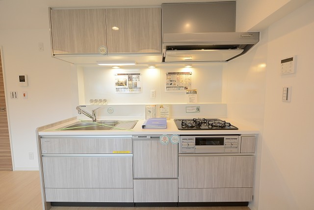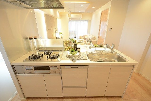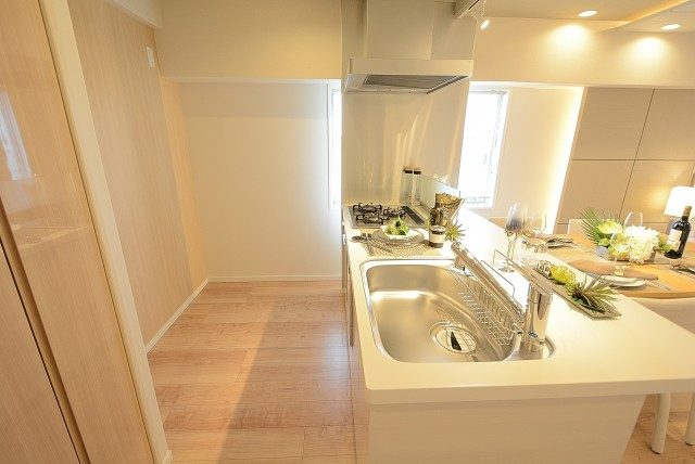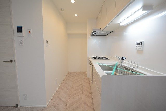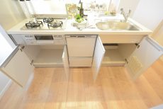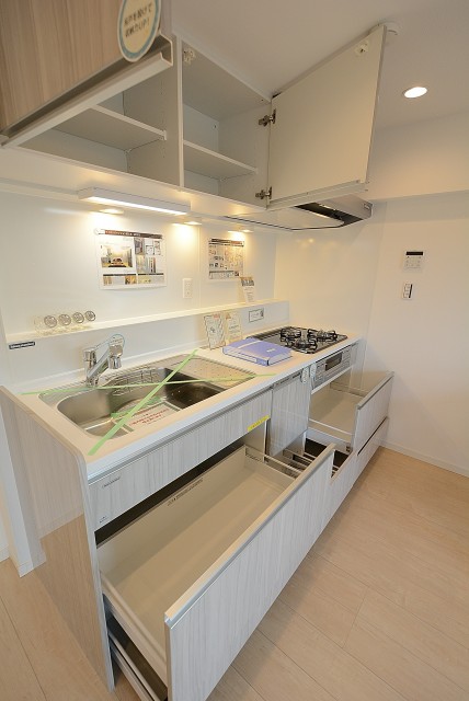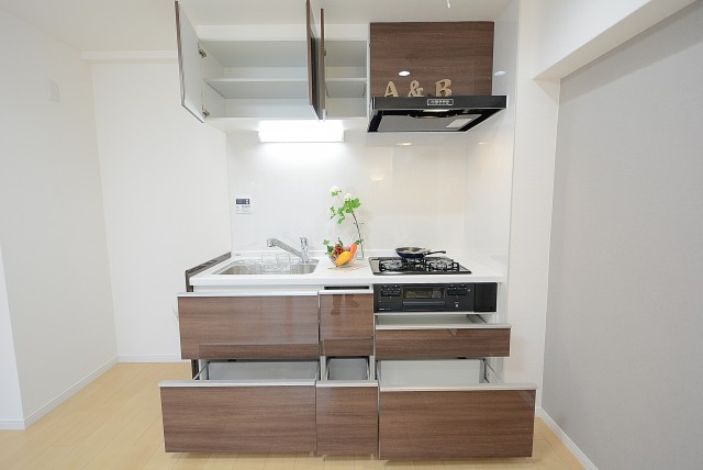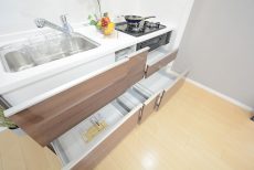 壁付キッチンは収納も上下にあり、作業スペースもきちんと確保されているので料理もスムーズに出来そう♪シンク下の収納は、スライド式で使い勝手が良いですよ♪♪