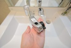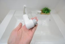 水栓はシャワーヘッドになっているので、洗面ボウルの隅々まで水を流すことができます。お掃除も捗りますし、簡単な洗髪もすることも可能ですよ!