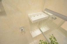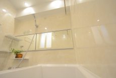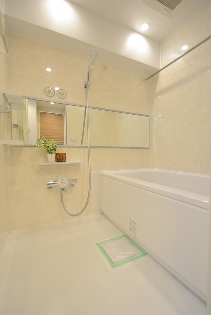 淡いベージュの優しい雰囲気のお風呂ですね。