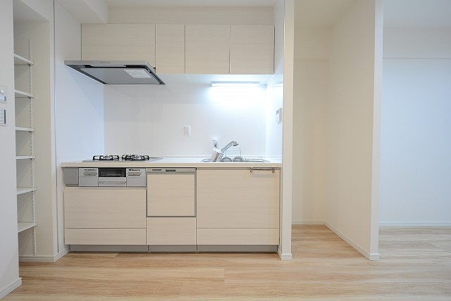 食器洗浄機付きなので、家事の負担も軽減♫冷蔵庫や食器棚を置けるスペースも充分で