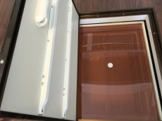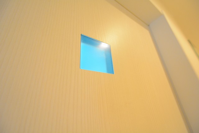覗き穴ではないですが、ブルーのガラスボックスがはめ込まれています。あまり見ないタイプのドアですが、少しのアクセントがあるだけでとても素敵な雰囲気になりますね!